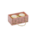 Stylish top-bottom cardboard box measuring 8.5 x 5.5 x 3.5 inches, featuring a pastel pink floral base and an elegant off-white lid with golden detailing. Comes with 2 glass jars and a golden rope handle, perfect for festive or elegant gifting.