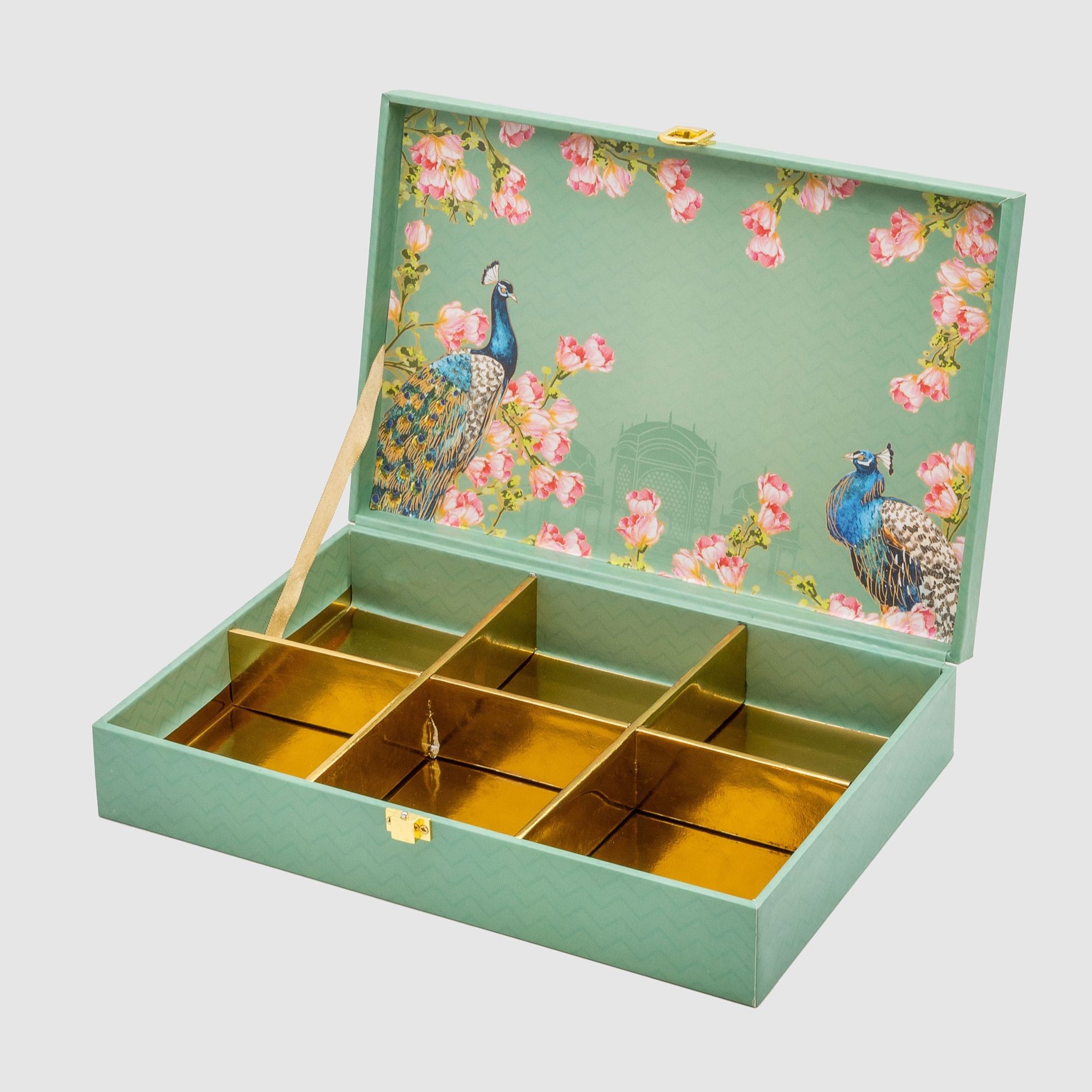 The interior boasts golden partitions, perfect for organizing dry fruits, sweets, or festive treats. Whether it’s for a wedding, festive occasion, or a special gift, this box blends functionality with royal aesthetics.