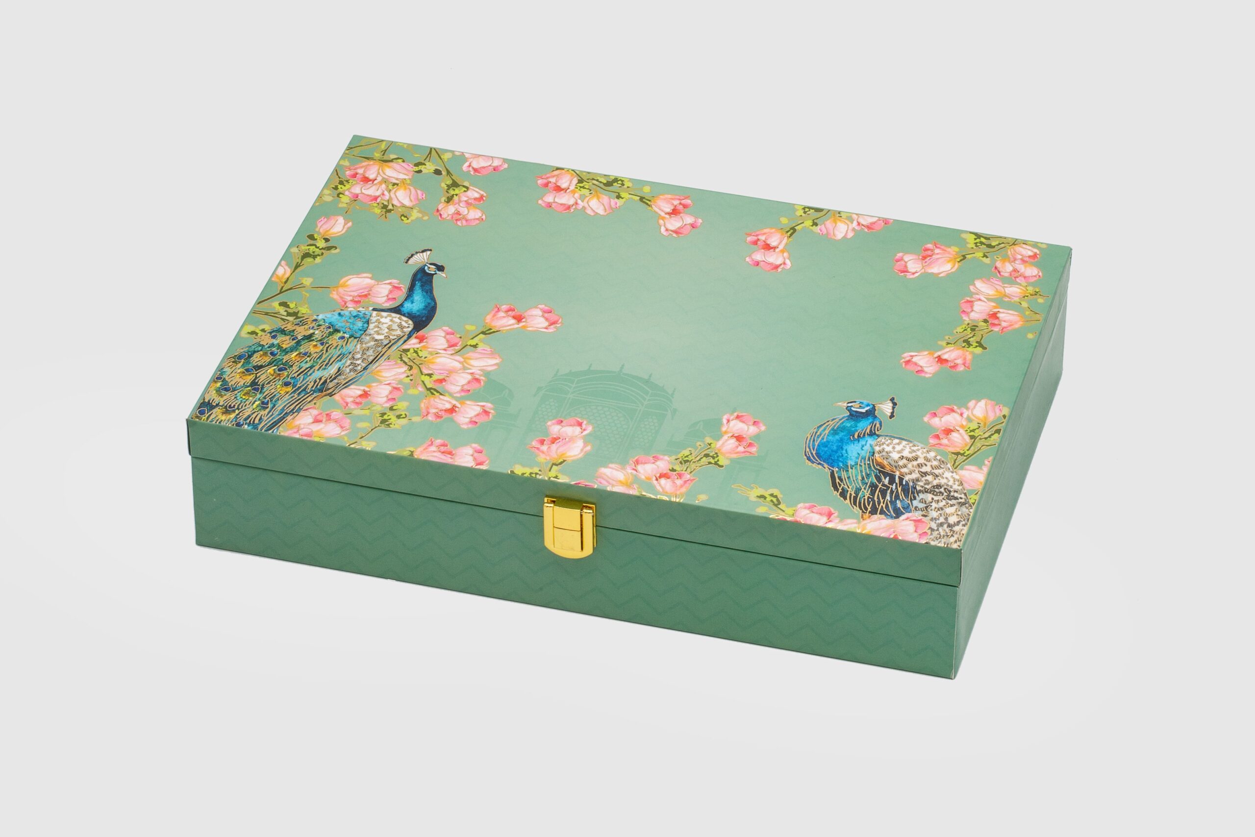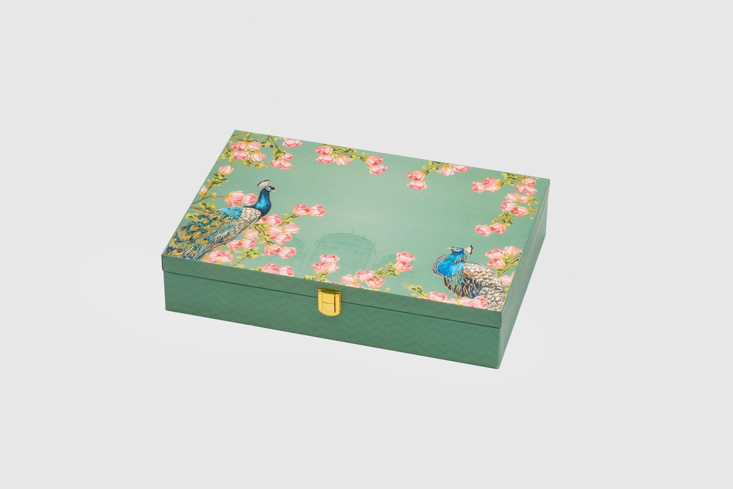 Add an elegant touch to your gifting with this beautifully crafted dry fruit box. Made from high-quality MDF, this 12x8x2 inch box features a serene green backdrop adorned with delicate cherry blossom motifs and twin majestic peacocks – symbolizing grace, beauty, and prosperity.